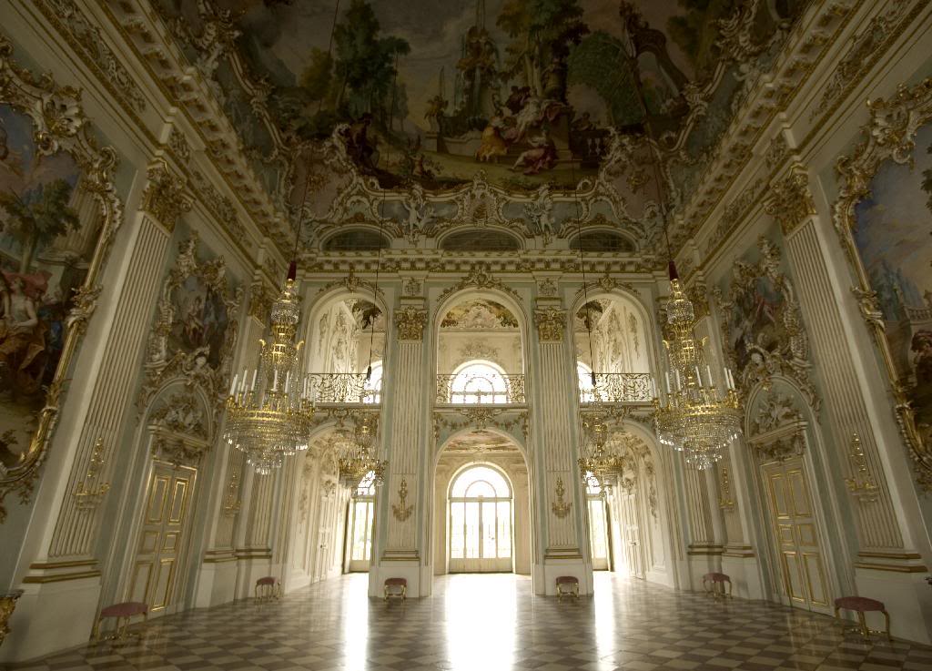 Three young women under the high ceiling.
